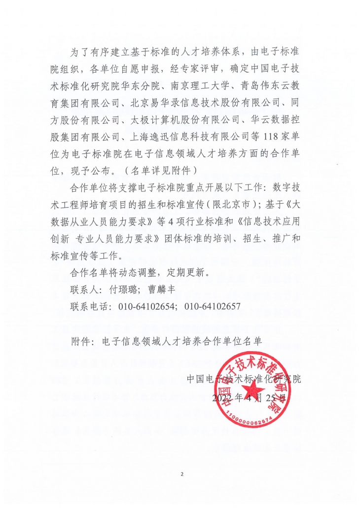 中国电子技术标准化研究院(以下简称“电子标准院”)于2022年04月25日公布了电子信息领域人才培养合作单位名单的通知。